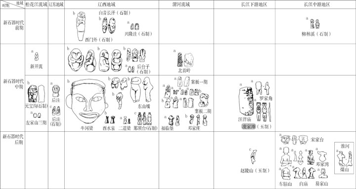 如果从偶像表现形式来看的话,可知各区域社会各自存在着特殊性。如新石器时代中期地处长江下游地区内陆的凌家滩文化中独特的偶像表现形式也体现于玉器,而新石器时代后期长江中游地区的石家河文化则发展出独特的人物和动物的塑像。