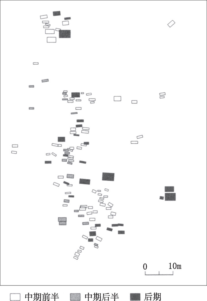 并且按时期不同从外观上来看,大型墓有逐渐增多的趋势。中期前半段的墓葬中大型墓的存在还不显著,而后期的墓葬中大型墓明显增多。另一方面小型墓在后期依然存在,可见墓葬大小的差距越来越大。如前所述,墓葬的大小反映着挖掘墓圹时投入劳动量的多少,修造大型墓说明被葬者得到厚葬的待遇,反映着被葬者在社会中的身份地位。