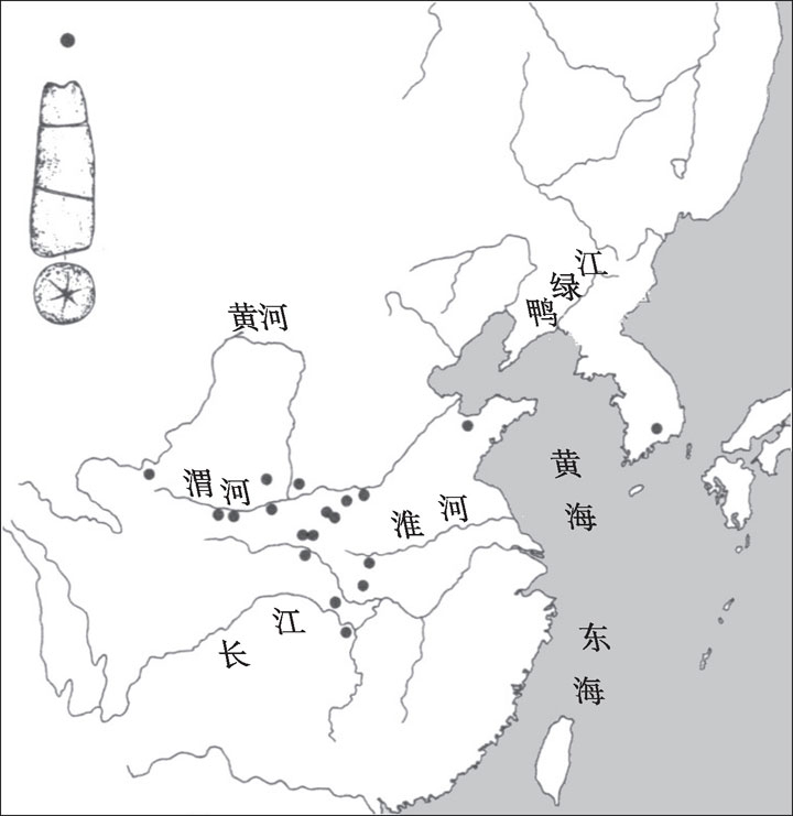 而渭河流域至黄河中游地区精神文化的区域特性则体现于陶祖(男根偶像)的表现形式。渭河流域至淮河上游地区在新石器时代中期出现了以男性直系亲即父系血缘组织为单位的社会构造。如第五章所述,在新石器时代后期,以这种单位为基础,社会的阶层化构造逐渐走向复杂化。而且该区域的这种以父系血缘组织为单位的群体组织的形成,在比长江中、下游地区更早的阶段就已达成。
