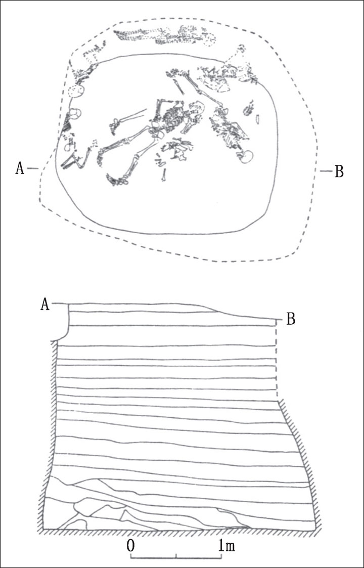 在多达88处的土坑中存放有大量的粟,由此可判断这些土坑为窖穴,但其中有的土坑中可见埋葬有猪或狗的事例。