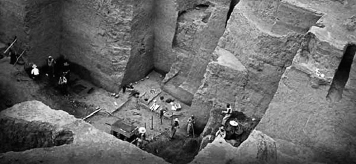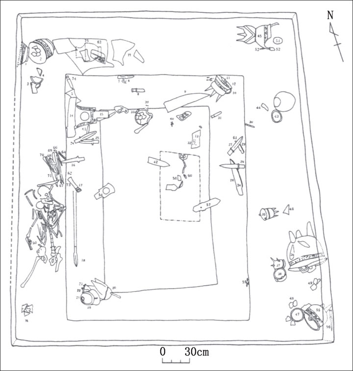 在1001号大墓的木椁周围出土了十二具殉葬者的遗骨。南墓道中还发现了五十九具头部被砍断的人骨。这些遗骨应该都属于人牲。王墓中不但有丰富的随葬品,还有许多殉葬者和人牲的遗骨。