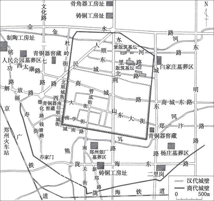 郑州商城是南北略长的都城,其中心地位于都城的东北角。与偃师商城的宫殿区一样,除宫殿外,还设有园池。宫殿和园池是东亚都城构造的原点,两者的存在说明当时王权已经确立。