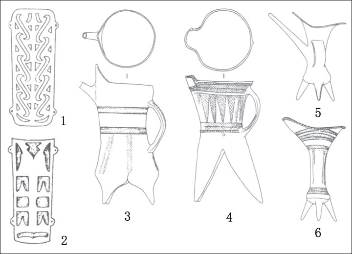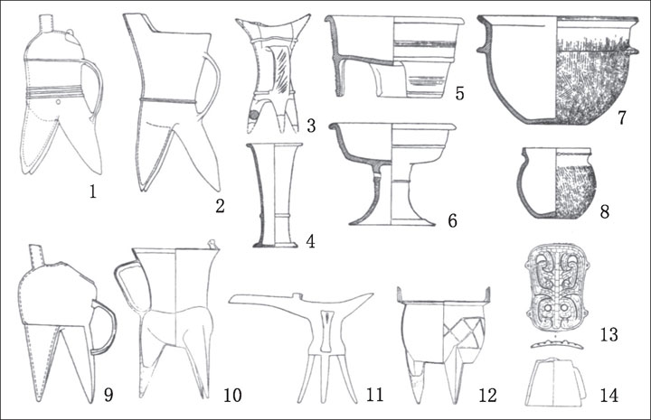 在辽西一带,属于夏家店下层文化的内蒙古敖汗旗大甸子遗址的墓葬随葬品中也可见到爵、盉、鬶等模仿二里头文化陶制礼器的陶器。随葬有爵、盉、鬶等特殊陶器的墓葬在大甸子遗址的墓地中属于极少数,从其随葬品构成及墓葬规模来看,墓主应当是属于社会最上阶层的人群。在这里,承接着二里头文化系统的陶器如第八章所述,是显示不同文化之间的交流的物证,并且拥有这些显示着物主与其他区域拥有交流的物资,正可以显示物主在群体内的社会地位。这大致相当于新石器时代中期的交流水平。另外,承接二里头文化谱系的牙璋扩散到四川盆地以至广东及越南北部,也显示着上述交流的一个侧面。