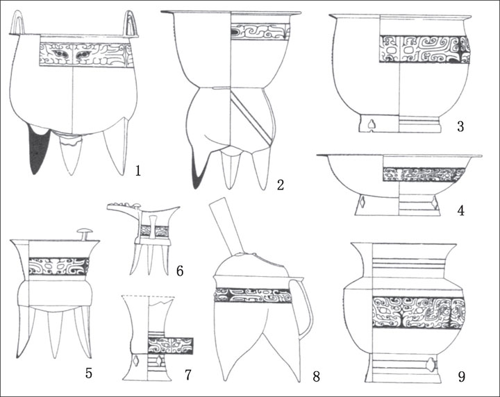 夏王朝的礼制则是以大汶口文化的身份标志为背景,这是因为夏王朝起源于黄河中游地区,这一带在大汶口文化后期有着曾受大汶口文化影响的文化背景。在上述文化背景之下,当地文化以此为基础逐渐向王湾三期以及二里头文化期发展。夏朝的礼制就是在扎根当地的发展中产生的。而商王朝的礼制虽然也吸收了二里头文化的精神文化,但却是以山东龙山文化期的礼制为其新礼制的典范。可以说是商王朝的起点即先商文化下七垣类型吸收了与其文化领域相邻接的山东龙山文化的礼制规范。自商代开始出现的饕餮纹也一样,如图148所示,与其说是通过二里头文化,不如说是直接与山东龙山文化的兽面纹有着谱系上的关系。