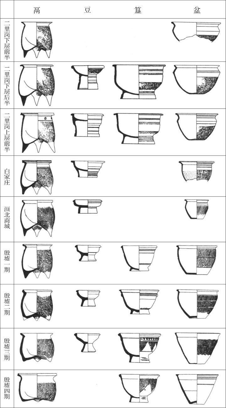 如前所述,二里岗下层文化以后即为商王朝阶段。其间约五百五十年,郑州商城及偃师商城并非一直是其中心。此前以郑州二里岗为中心的陶器编年与以殷墟为中心的陶器编年之间存在着型式上的隔绝。两者的连续性如何说明的问题尚未解决。二里岗编年分为二里岗下层和二里岗上层,二者又各分为一期和二期。其中二里岗上层二期即相当于郑州白家庄期的阶段。