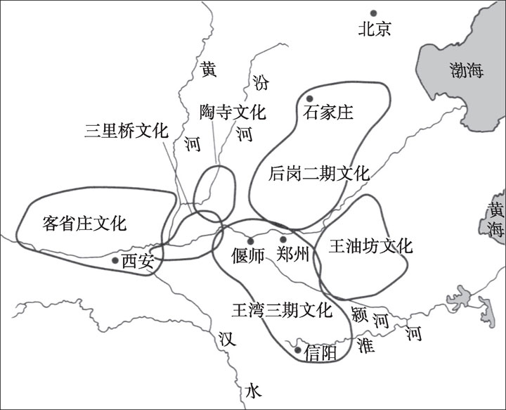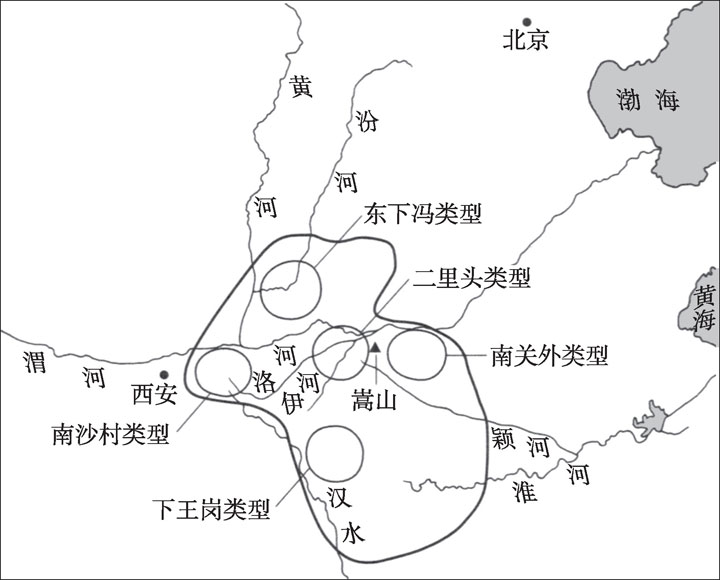 二里头文化承接着曾经存在于黄河中游地区的河南龙山文化的谱系,尤其与其中的王湾三期文化有着直接的关系。河南龙山文化也可以从陶器样式的内容,特别是从器种构成进行进一步的区域划分,具体说来,可分为图133所示的区域文化样式。