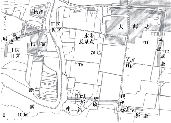 该处城址的城垣存在于龙山文化终末期至新砦文化期,废弃于二里头文化早期。城垣北壁长924米,东壁南侧因遭破坏只剩下160米,西壁也只剩下470米,南侧被双洎河毁坏。城垣部分环绕的面积据推测达70万平方米。城垣周围建有壕沟,其外侧还有东西长达1500米的外壕。而在城址内部的西南部地势较高的部分还有内壕,其中心部分为东西宽50米,南北长14.5米的大型建筑物。