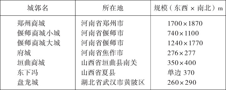 而在二里岗下层期,除了郑州商城和偃师商城之外,还建有山西省夏县东下冯、山西省垣曲商城、河南省焦作市府城、湖北省武汉市黄陂区盘龙城。这些城址的规模如图152列表所示,如果以郑州商城为第一级别的话,偃师商城就是第二级,其他商城则可划分为第三级。郑州商城仅内城规模就大于偃师商城的大城,而在其内城外层更筑有外城,两者规模大小的差距显而易见。并且这些城址均建于二里头文化的聚落之上,存在于二里岗下层和上层期,荒废于郑州白家庄期前后。这个时期也对大致对应着郑州商城的存续时期。