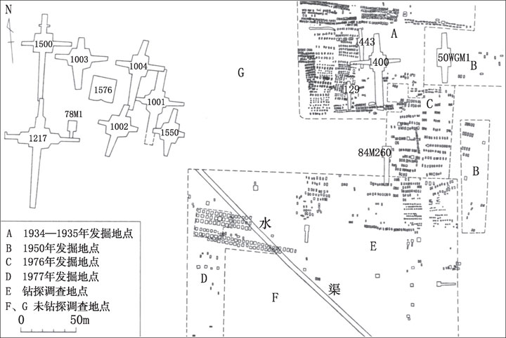 上述宗族单位的墓地在殷墟之内形成,如前所述,其位置分布是以西北岗的王陵区为顶点,位居其下的是如后岗墓地那样,阶层属于第二等级的宗族墓地。宗族单位的墓地位置显然是依据以商王为顶点的金字塔式阶层构造而决定的。