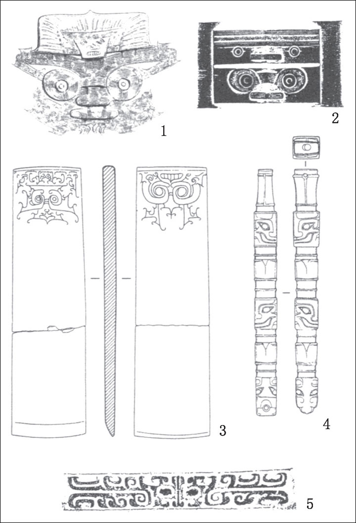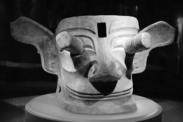 此外,在三星堆遗址还出土了双目突出的特殊的人物假面和人头像,还有高达2.62米的人物立像,4米高的巨大神树等,可见当时形成了极富特色的青铜器文化。这些青铜器因此被称为令人惊叹的三星堆文化。然而三星堆文化的生成过程首先要放在前述以商王朝为中心的关系网之中来看才易于理解。