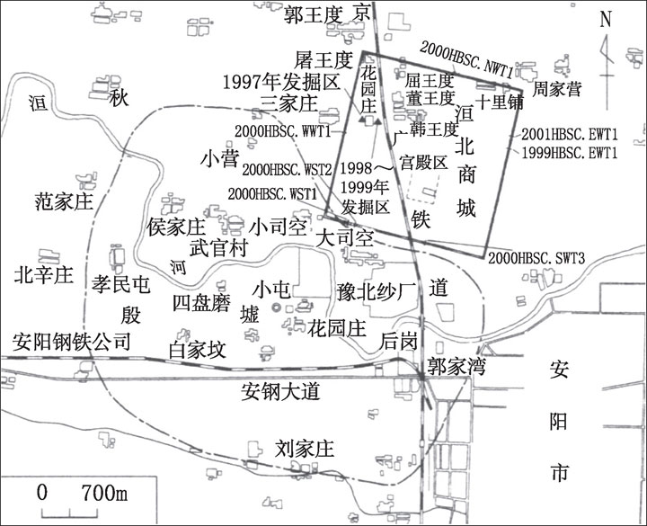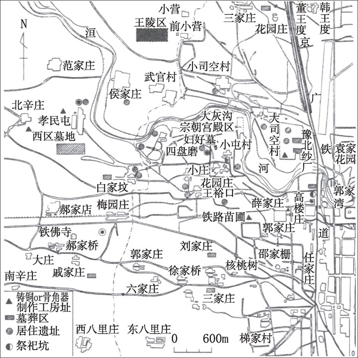 殷墟位于洹北商城的南侧,王宫和宗庙被洹河及环壕围绕其中。在其西北有王陵区,附近为后岗墓地,西南为郭家庄墓地,南面是三家庄墓地,西侧还有西区墓地等,这些王陵和墓地都以王宫和宗庙为中心分布。殷墟即由上述宗庙和墓地构成,俨然呈现出祭祀城市的形态。殷墟在武丁期以后开始正式发挥作用,盘庚以后共十二代商王,除最后一位辛帝之外的十一位商王有可能被埋葬于西北岗的王陵区。王墓因其形状被称为“亜”字形墓,从方形墓圹向四方延伸出四条墓道。墓圹内为棺椁构造,曾拥有丰富的随葬品,但大部分王墓都遭到盗墓者破坏。