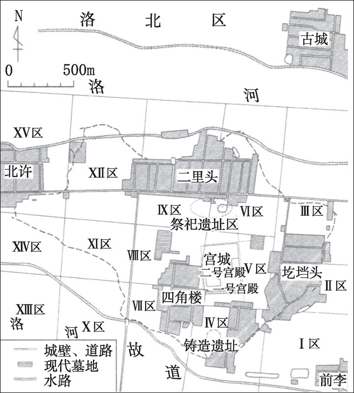 另外,还发现了相当于文献中的“墠”的半地穴式建筑物,其形状呈平面长方形。在低浅的地穴内部,有用脚踏平的整齐的土层,另外还有烧土层。这里也是用于举行祭祀活动的场所。虽不知祭祀仪礼的具体内容,但可知祭祀空间已经被固定下来。另外宫殿区南侧有用于铸造的遗迹,是青铜器作坊的区域。因此可以说在这里与政治中心性质的空间一同存在的,还有祭祀空间以及专业化的工匠组织,形成了共存于平面范围内的城市空间。