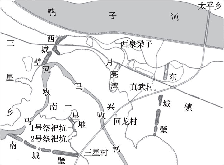 1986年,三星堆的城郭内部发现了两个土坑,从中出土了大量青铜器、玉器和象牙。两个土坑建于遗址的终末期,很可能是某种祭祀遗址。出土的青铜器中,青铜容器均为尊、罍等大型器,商王朝的青铜彝器是其原型。从制造年代来看,应当是在相当于商晚期的三星堆第四期。另外,一部分青铜容器类似于长江中游地区商晚期独自制造的华中型青铜器。