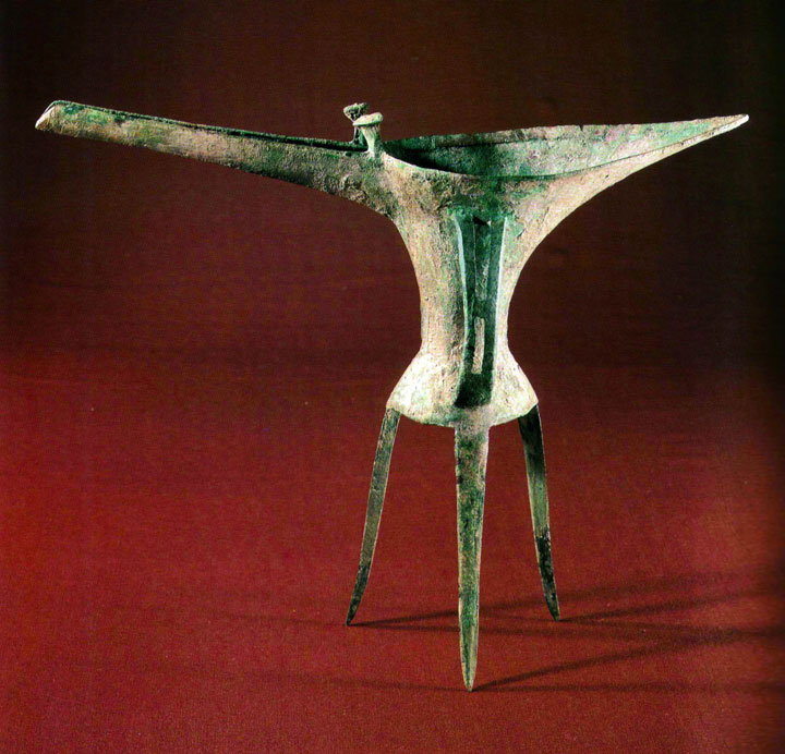 图一 二里头遗址出土的青铜爵 ——迄今为止发现的中国最早的青铜酒器。爵的母型是自新石器时代就开始存在的注酒用的鬶和喝酒用的杯。在二里头文化期形成了用于饮酒的陶制爵。青铜爵模仿陶制爵的形状,以青铜制成。