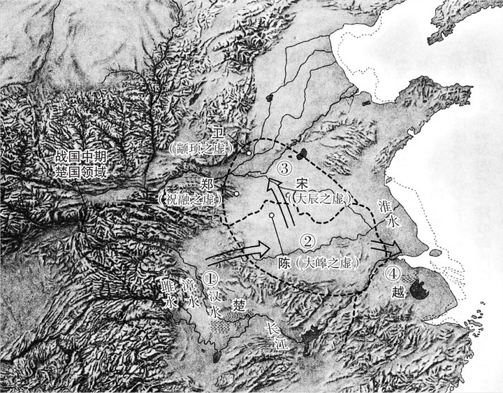 如此一来,我们就可以认为战国时代楚国的特别地域不局限于湖北、湖南一带,而且还进一步向外延伸,涵盖了已经多次提及的殷商故地,以及前文提到的宋、卫、陈、郑四国之地了。只是,楚人继承的并不是商王朝,而是楚人自己的祖先祝融及颛顼的故地而已。