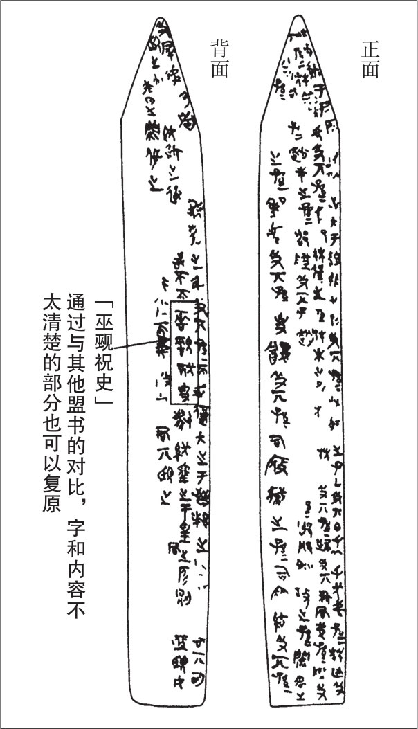 不只是盟书,在关于盟誓“仪式”的资料中,也从未发现关于西周之前的记载。这一点也与前面提到的内容有些关系。殷和周之外的诸侯国并没有使用汉字,所以连君主的在位年限也没有完全记载下来。盟誓是一种对神起誓的行为,必然从远古时代就已经存在了。我们认为,盟誓不一定需要通过文字来实现,比如像小孩之间互相勾小指头之类,也是实现彼此之间约定的一种“仪式”。