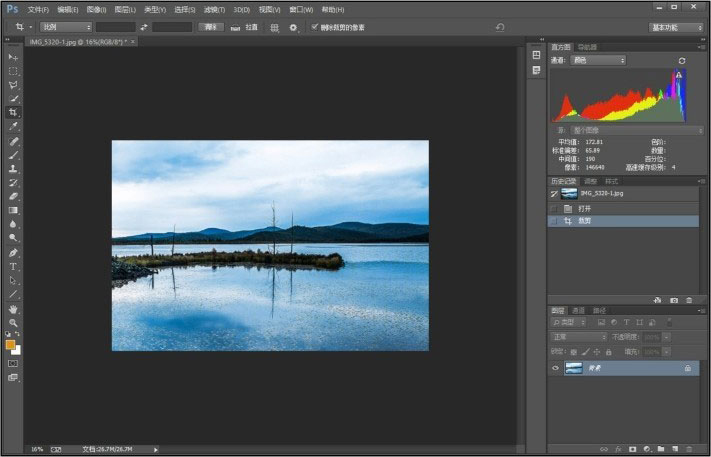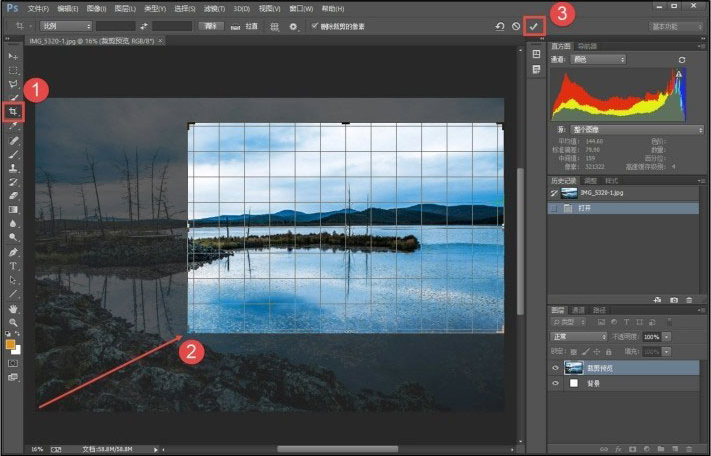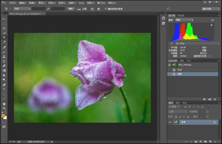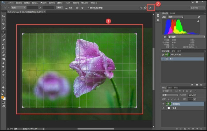 打开示例图片。选择“裁剪工具”,拖动裁剪边线到想要保留的位置,然后单击提交裁剪图标“√”,完成裁剪。