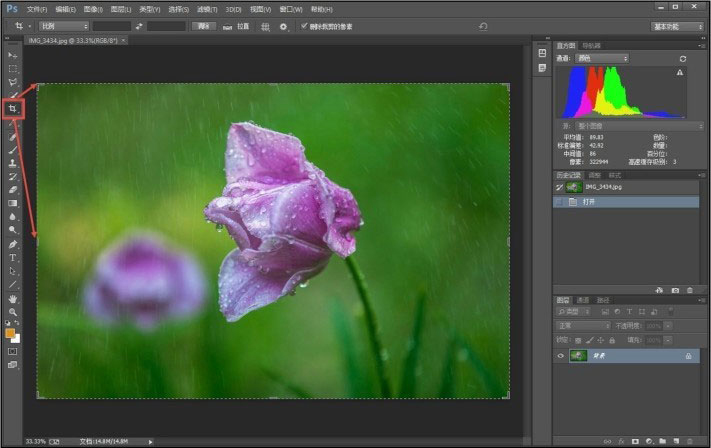 在软件左侧的工具栏中,选“择裁剪工具”,此时可以发现照片四周出现了明显的裁剪边线。