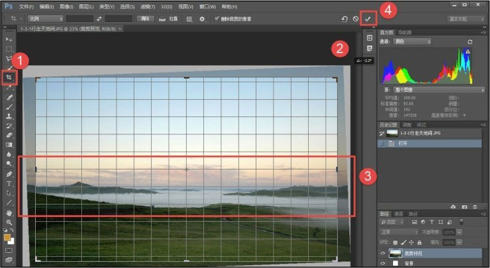 松开鼠标后,此时可以发现倾斜的照片已经被校正了回来,然后单击上方的提交裁剪操作图标“√”,完成拉直操作。