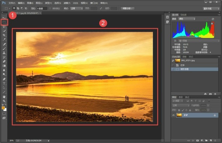 对于这种画面,我们需要选择“矩形选框工具”,整体勾选照片(当然,也可以直接按Ctrl+A组合键选中整体画面)。
