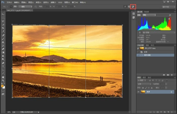 调整完毕后,画面变得比较规整,水平也被校正了过来,然后单击右上角的提交变换图标“√”完成处理。