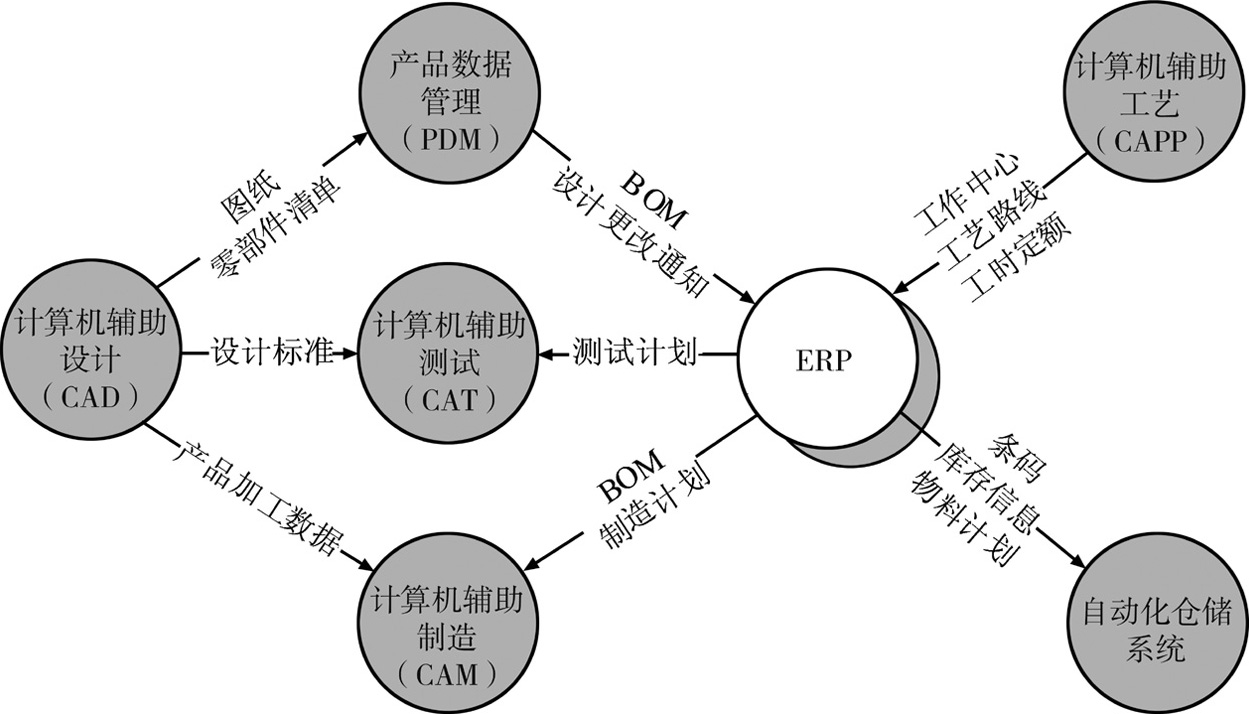 ERP是一种集成的信息系统,但显然它也仅仅是企业信息化应用的一个组成部分,企业信息化这个领域还有着更丰富的内涵。随着信息技术的迅速发展,除了ERP外,近十余年来企业信息化领域新的技术与产品不断涌现并投入应用,如计算机辅助设计(Computer Aided Design,CAD)、计算机辅助制造(Computer Aided Manufacturing,CAM)、计算机辅助测试(Computer Aided Testing,CAT)、计算机辅助工艺(Computer Aided Process Planning,CAPP)、产品数据管理(Product Data Management,PDM)等,这些单元技术及系统集成起来,通常称为计算机集成制造系统(Computer Integrated Manufacturing System,CIMS)。