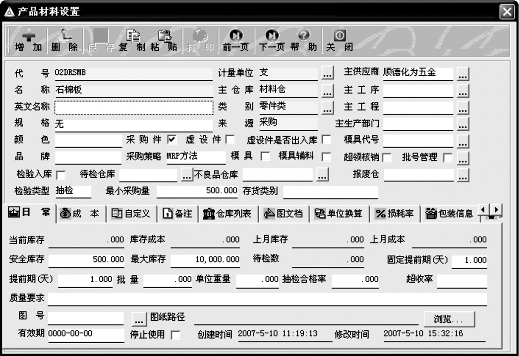 (3)物料的库存属性:通常包括物品来源(自制/外购)、库存单位、ABC码、物品库存类别、批量规则、批量周期、年盘点次数、盘点周期、积压周期、最大库存量、安全库存量、在库数量、库存金额、默认仓库、默认库位等。