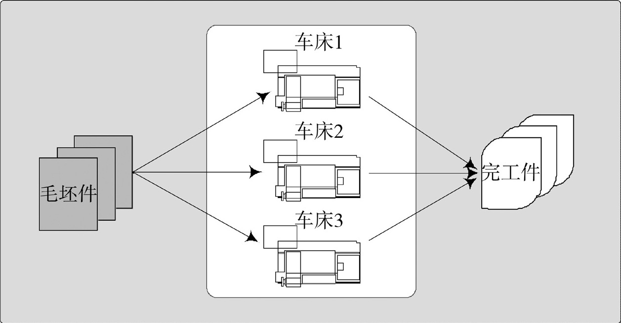 (1)并行作业。此类工作中心相当于一个相同加工工序的群组,如车床组、钳工班等,作业特点是物品在该工作中心的加工可以由该工作中心的任意加工单元完成。此类工作中心的工作效率等于单个加工点的工作效率乘以工作中心内加工点数(假定每个加工点的工作效率是一致的)。例如,在图2-9中,每个车床加工某工件的效率为100件/小时,那么该工作中心的总加工效率为100×3=300件/小时。