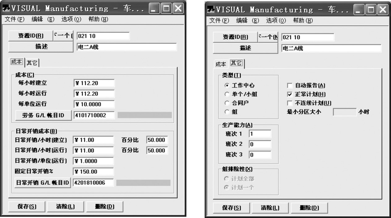 工作中心的能力数据有两个方面,一是工作中心的有效工作时间,如每天或每周的工作小时数,常以“小时/工作日”为单位,一般在工作日历(将在§2.6中专门介绍)中设置;二是工作中心的工作效率,即单位时间内可加工多少产品,通常以“件/小时”、“吨/小时”等为单位,这个数据会因加工的产品不同而有所不同,通常在工艺路线(将在§2.5中专门介绍)中设置。