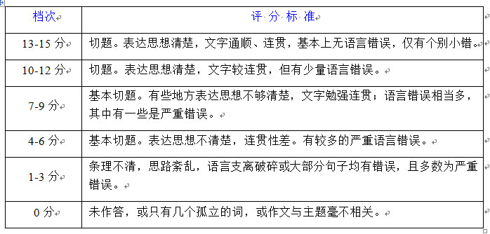 本题满分为15分,成绩分为六个档次:13-15分、10-12分、7-9分、4-6分、1-3分和0分。各档次的评分标准见下表: gJjjxTQr6KNOVJ9wP/DfGydlouYEG32Cdd+rtH/pKn6SY0mFhvdwkHI6oXCaUKpv
