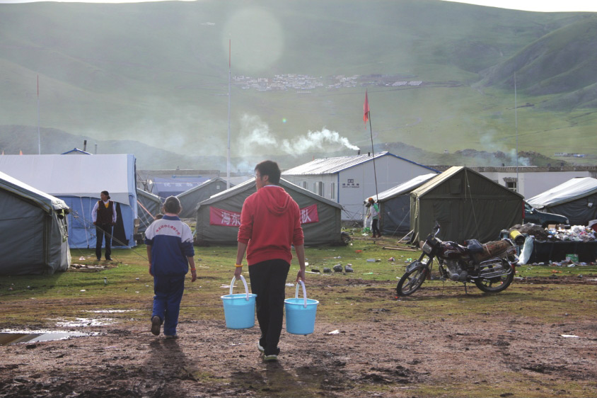 由于是临时安置的校舍,这里没有任何的围墙,一边是加班加点赶工期的重建工地,另一边是辽阔的草原和起伏的山丘。没有围墙的校园,任何人都可以进进出出,包括那些悠闲啃草的牦牛和随意溜达的土狗。看着地上还冒着热气的新鲜牛粪,我感觉这里完全做到了人与自然的和谐共处。