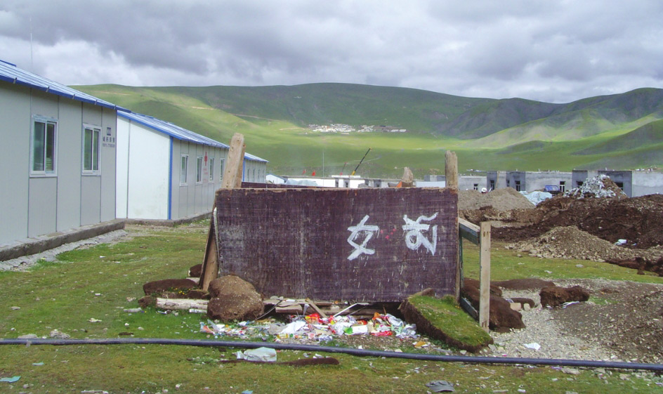 学校的角落只有两个简陋得不能再简陋的厕所,一个女用,另一个男用,分别用汉、藏两种文字显著标明。每个厕所可同时容纳两三人使用。说其简陋,是因为厕所由四块木板围着,下挖大坑,铺上木条块而成,既不能挡风,又不能遮雨。