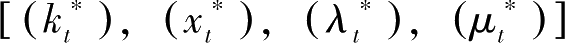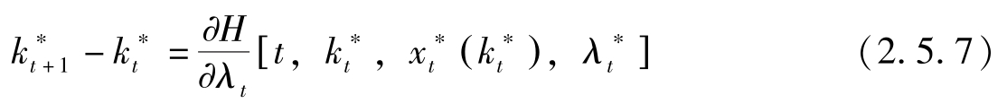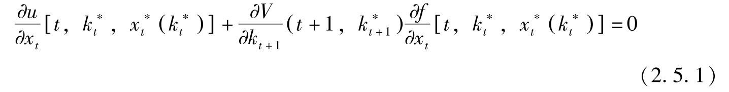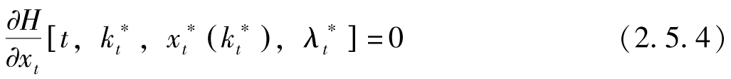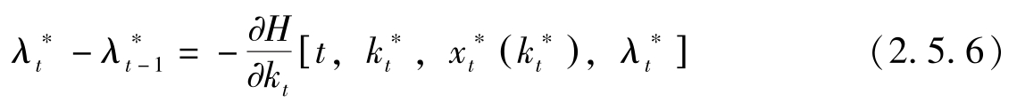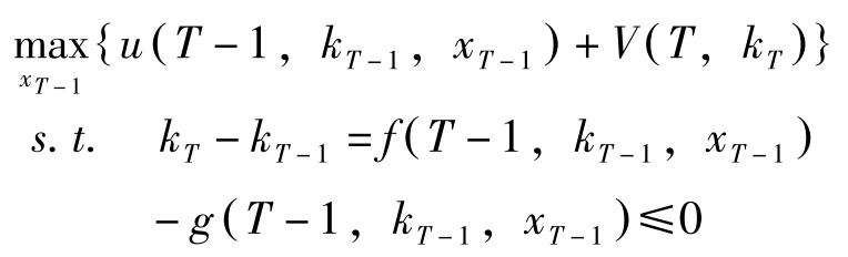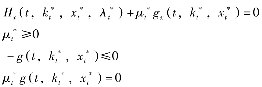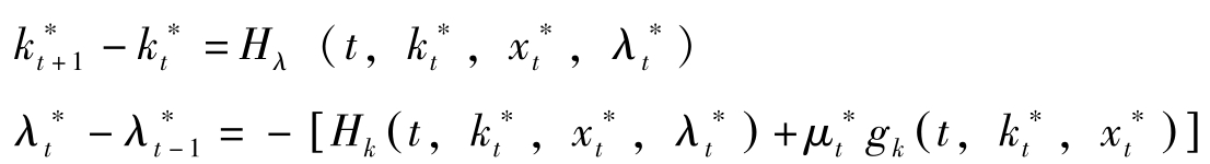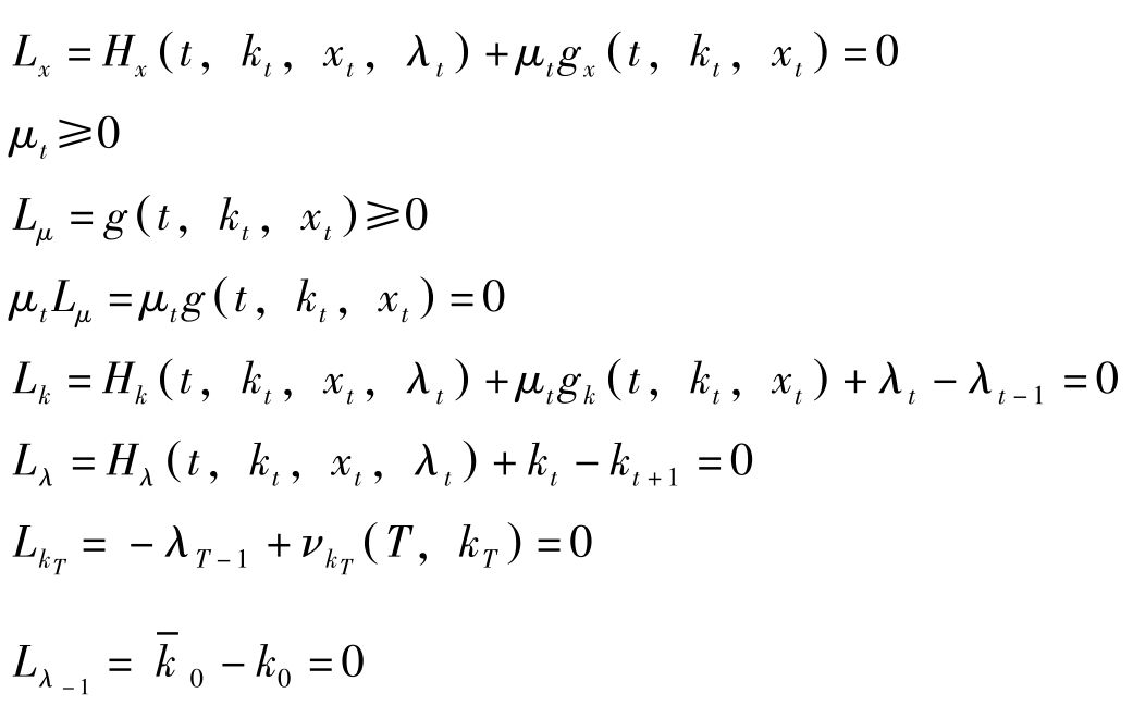 其中 H t k t x t λ t )= u t k t x t )+ λ t f t k t x t )称为现值的Hamilton函数。因此,对于 t =0,1,…, T -1,库恩塔克条件如下: