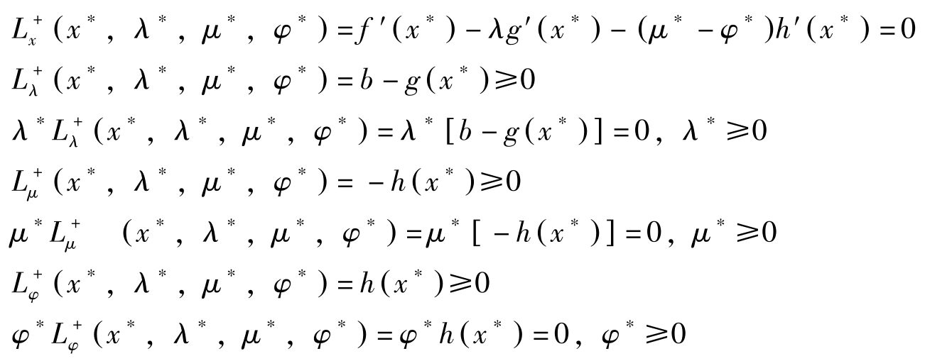 L + x λ μ φ )= f x )+ λ b-g x )]+ μ [0 -h x )]+ φ {0-[ -h x )]},则混合型(NLP)的库恩塔克条件可表示为: