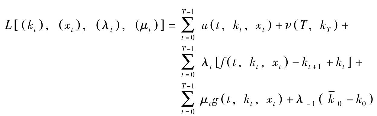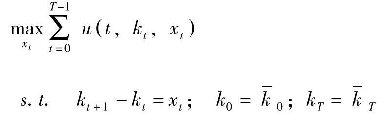 这是最典型的离散时间的动态问题。其中 x t 表示控制变量(消费), k t 表示状态变量(资产存量), T 表示计划的期间, u t k t x t )表示 t 期的效用, ν T k T )表示期终残存资产的效用的现在价值。第一个约束是状态变量的运动方程,表示家庭资产的变动依赖于期初资产、利息率、支出额与收入额;然后是环境制约,如资产存量非负、劳动供给非负、消费需预付现金等约束;最后是期初条件。