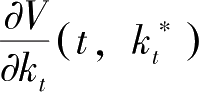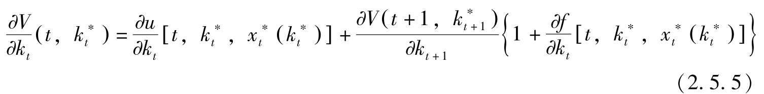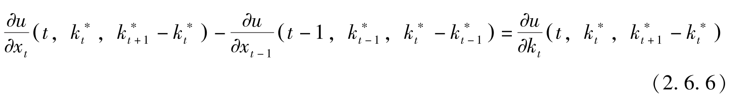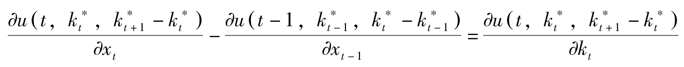 该式左边为 t -1期投资品 k t -k t -1 的影子价格, V t k t )表示 t 期资本的总价值,右边表示 t 期资本的边际价值,也即 t 期资本的影子价格。该式表明 t -1期投资品价格必须等于 t 期资本的价格。