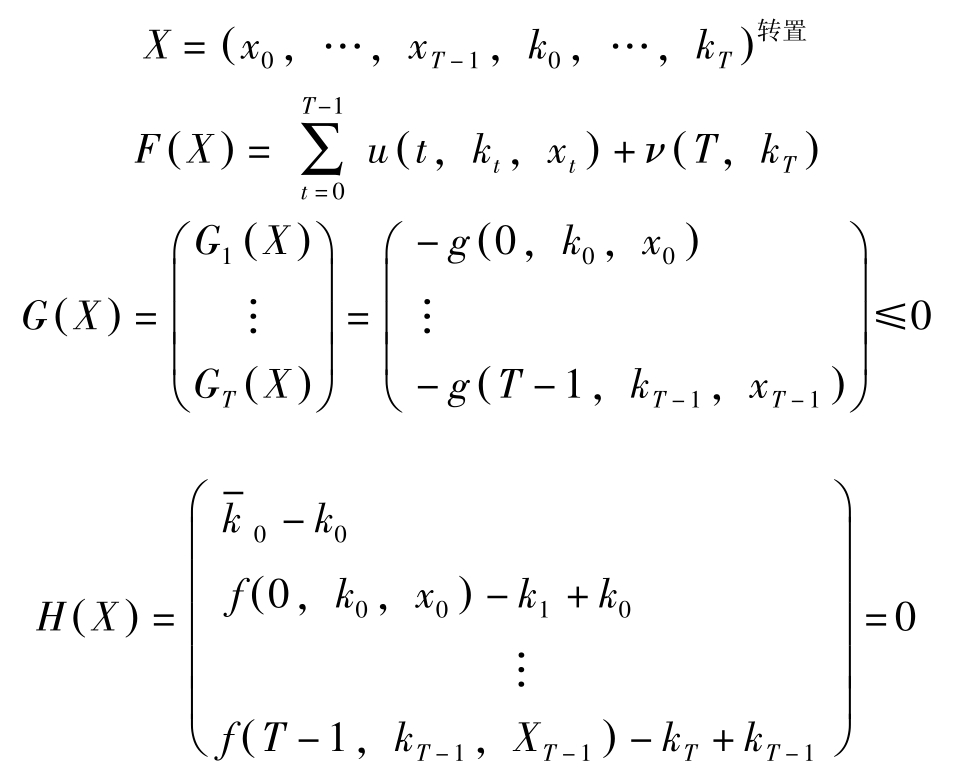 运用最大值原理(Maximum Principle)求解时,并不把 t 看成历史时间,而是将其看作外生变量,也就是说,不是把 x t k t 看作随时间变化的变量,而是将 x 0 x 1 …, x T -1 k 1 ,…, k T 看成独立的变量,把状态方程与环境约束通通看成约束条件。将(P)看成静态问题(NLP),采用(NLP)的方法进行求解。