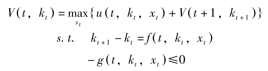V ( t , k t )= u [ t , k t , x t ( k t )]+ V { t +1, k t + f ( t , k t , x t ( k t )]}; t =0,…, T -1