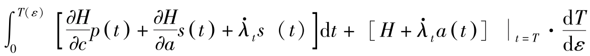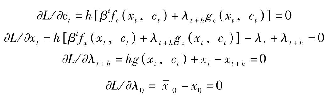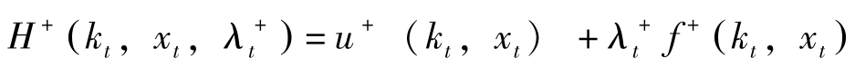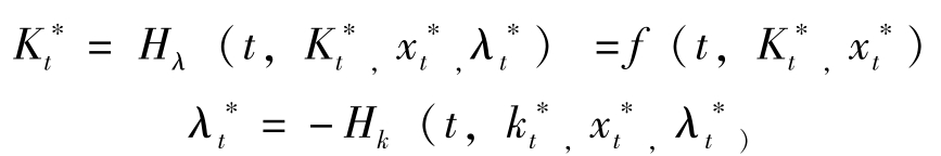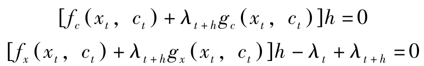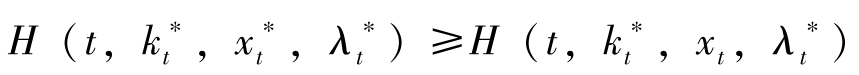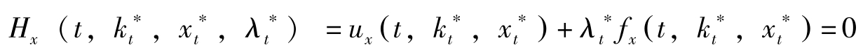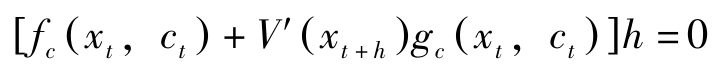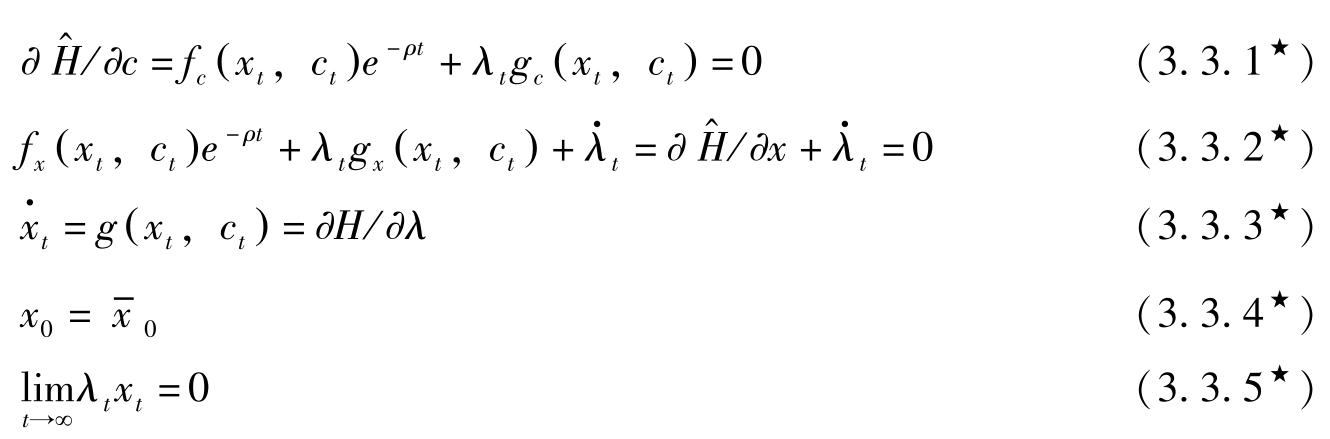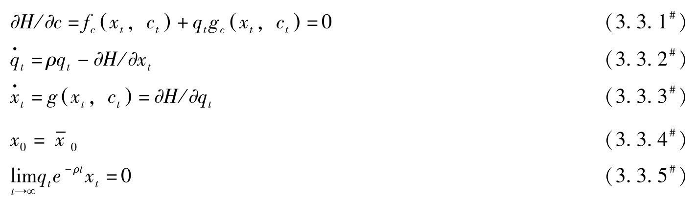 若令 H = f ( x t , c t )+ q t g ( x t , c t ),其中 q t = λ t e ρt 表示状态变量影子价值的当期价值, H = H ^ e ρt 。则最优解的必要条件可转换为: