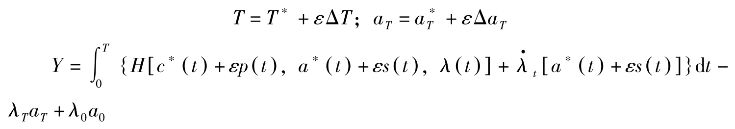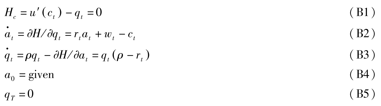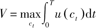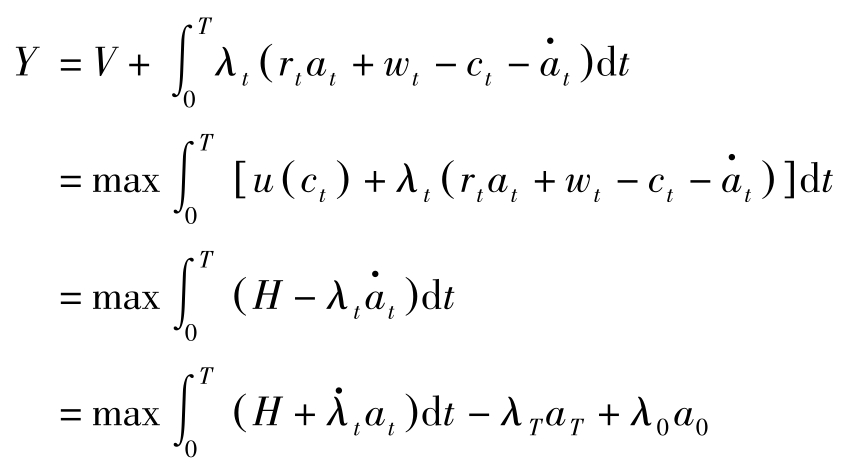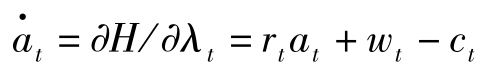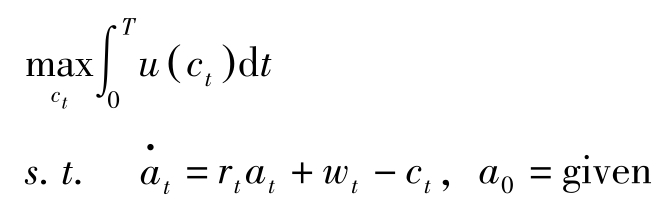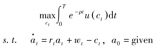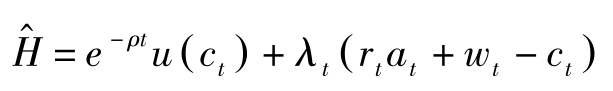 其中, T 为计划期界, c t 表示家庭的消费, u ( c t )表示瞬时效用, a t 表示 t 期期初资产存量, r t 表示利息率, w t 表示工资。