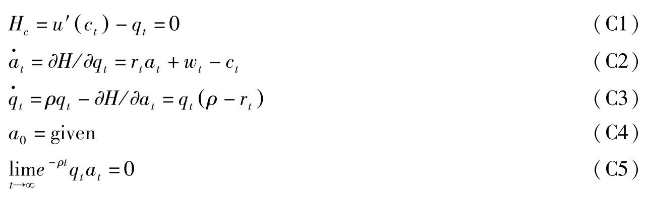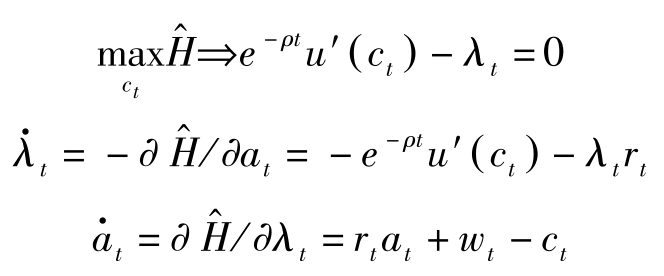 记 H = u ( c t )+ λ t ( r t a t + w t -c t ),则最优解的必要条件如下: