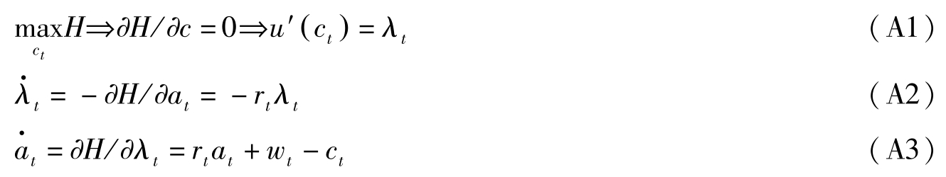(A3)式可直接由 H = u ( c t )+ λ t ( r t a t + w t -c t )推出,即