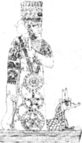 在这幅图画中,马尔杜克身穿华丽的衣衫、左手紧握象征着君王权利的杆与环、站在一条蛇龙身边。