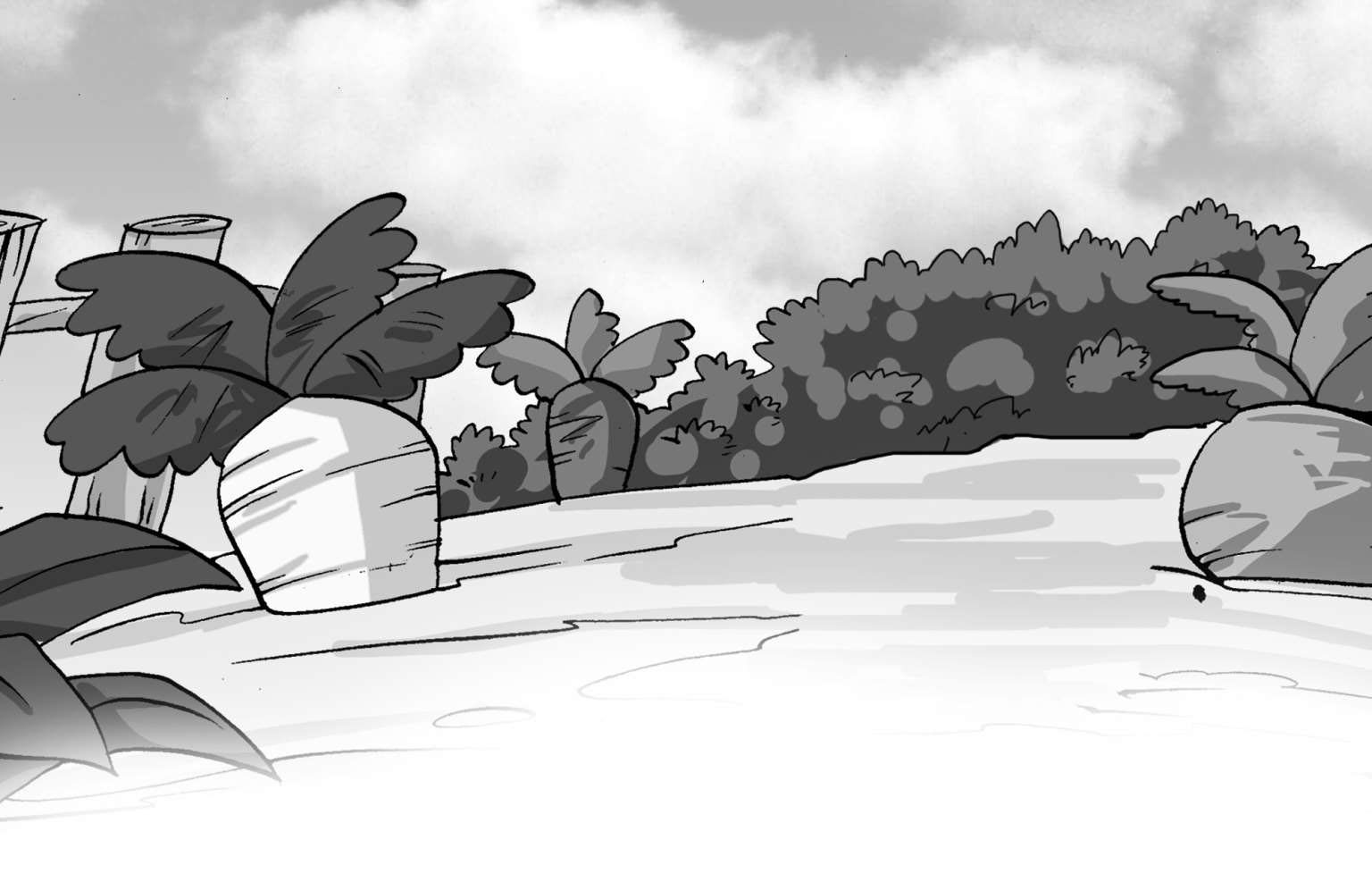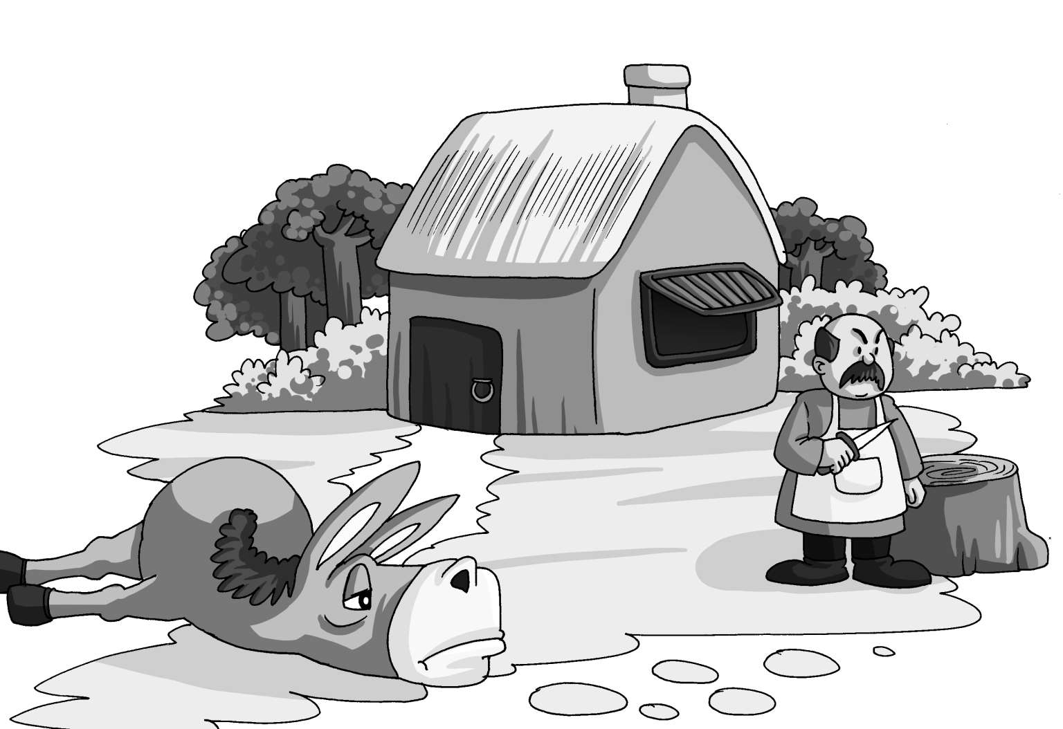 四只大公鸡跳进了菜园,神气活现地扒拉着地面,找寻刚种下的菜籽。驴子猛地冲了过去,尥了几下蹶子,把公鸡踢出了菜园。