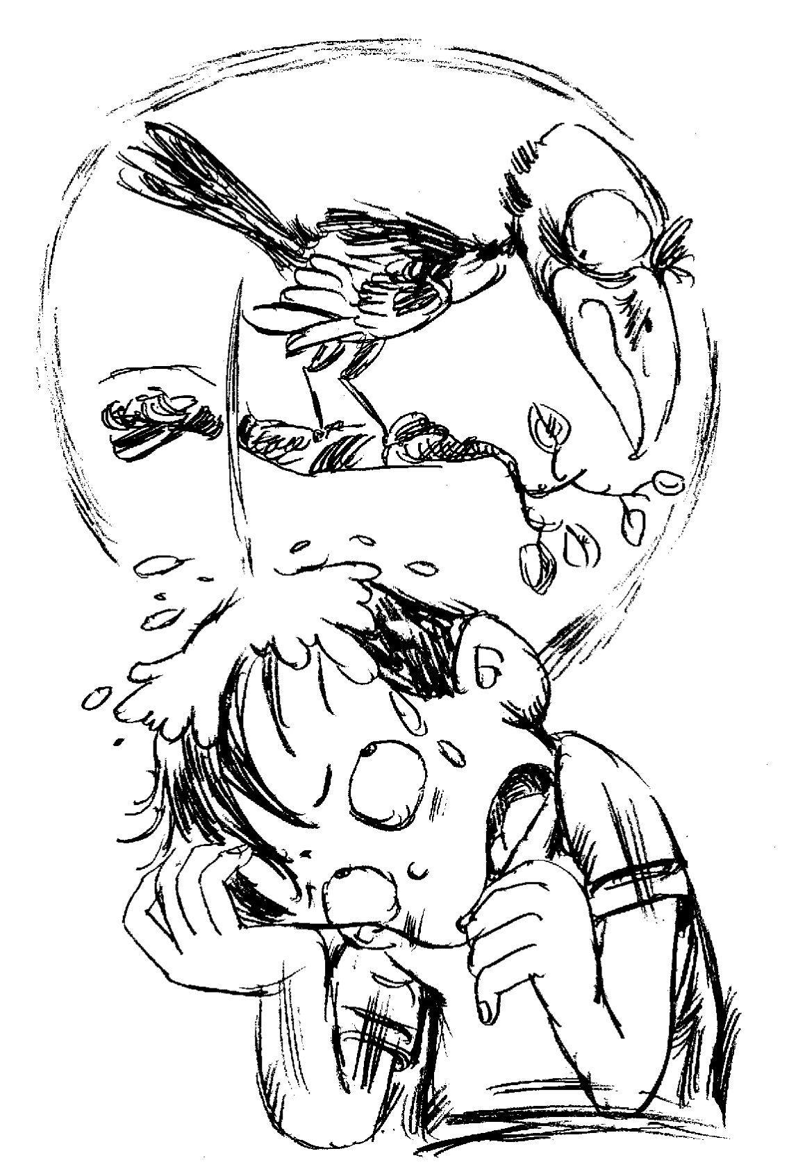 我飞快地打开灯、跑下床、冲到镜子面前,照了一下镜子。我看见我鼻子的下面,下巴的上面,竟然长了一张黑色的、又尖又丑的乌鸦嘴!我也吓得发出一声尖叫:“啊!”