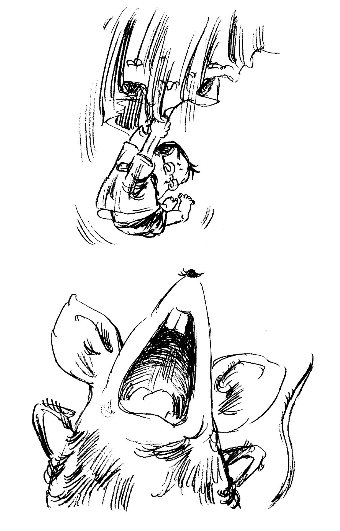 我寻声望去,发现我那只有拇指大的爸爸,正紧紧地抓住床单在床铺的边缘摇晃。床底下,有一只大老鼠正张着嘴巴,守株待兔地等着爸爸往它的嘴里掉。
