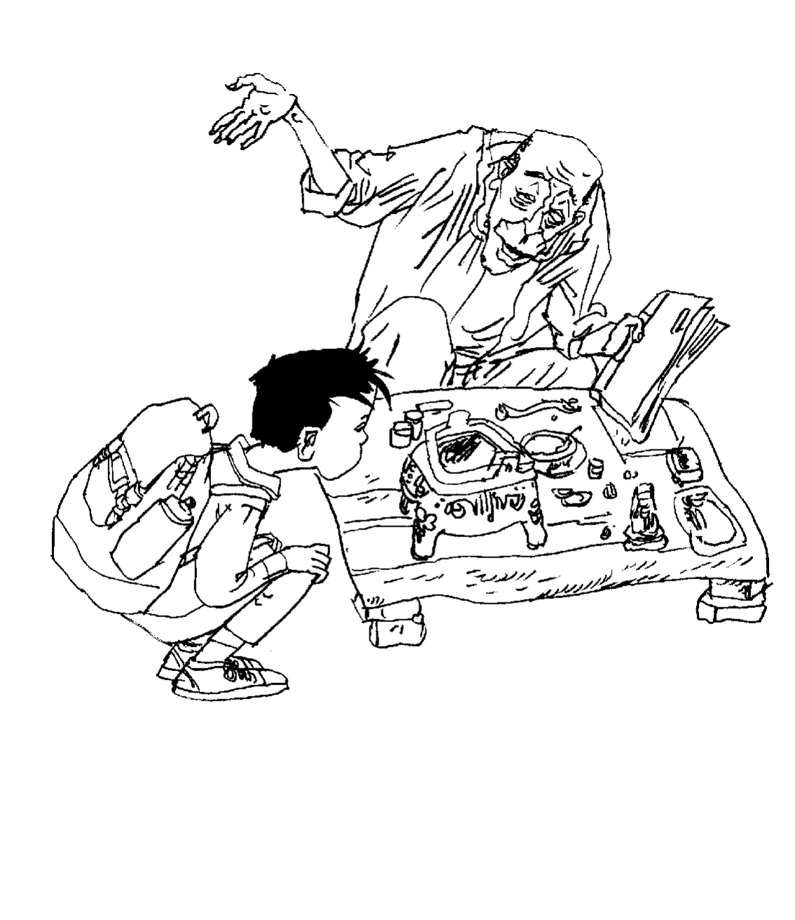 老头儿两眼放光地说:“呀,小朋友,你对鼎感兴趣吗?想不到你小小年纪,却有如此见识!我跟你说件事,你可不兴到处乱说哦!(他说话的时候,目光往四下里瞟,像是怕被人听见。)这个鼎啊,是商朝的文物,我们家世代书香门第,又有钱又有势,这是我们的传家宝……唉,后来家道中落,不得以只好将祖传下来的宝贝拿到这个地方贱卖……”