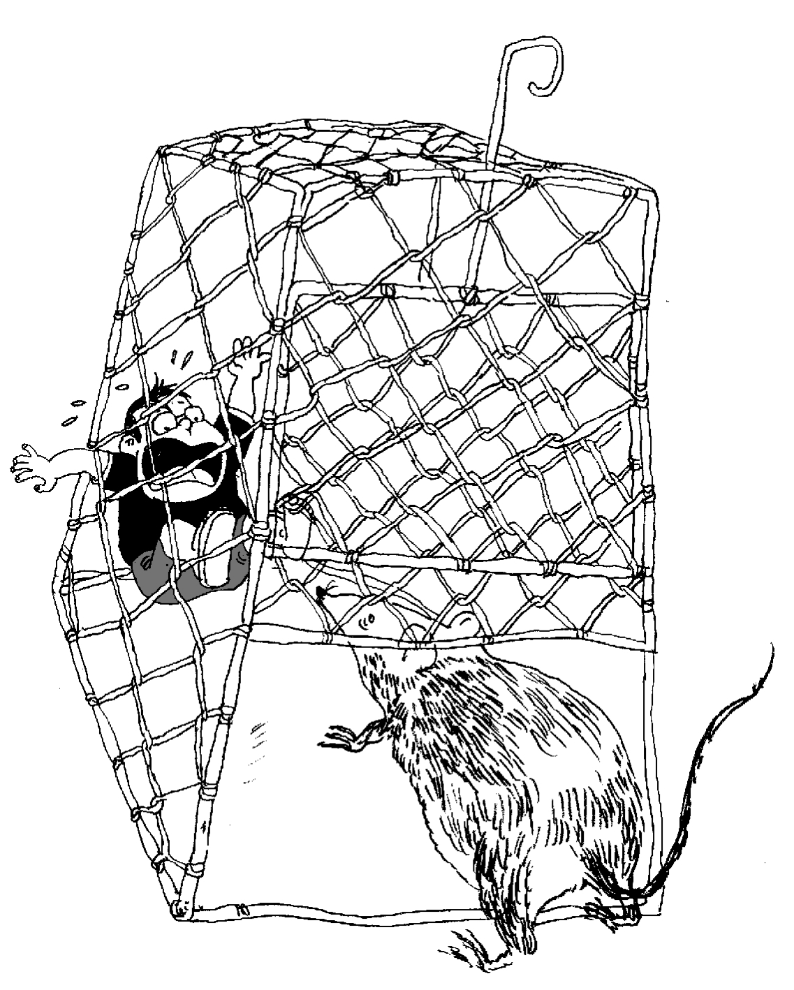 我飞快地跑到客厅里,看见爸爸和一只又肥又大的老鼠一起被关进了笼子里面——爸爸一定是等不及了,自己钻进老鼠笼子里当诱饵!现在,他被老鼠逼到了笼子的一个角落里,吓得全身瑟瑟发抖。