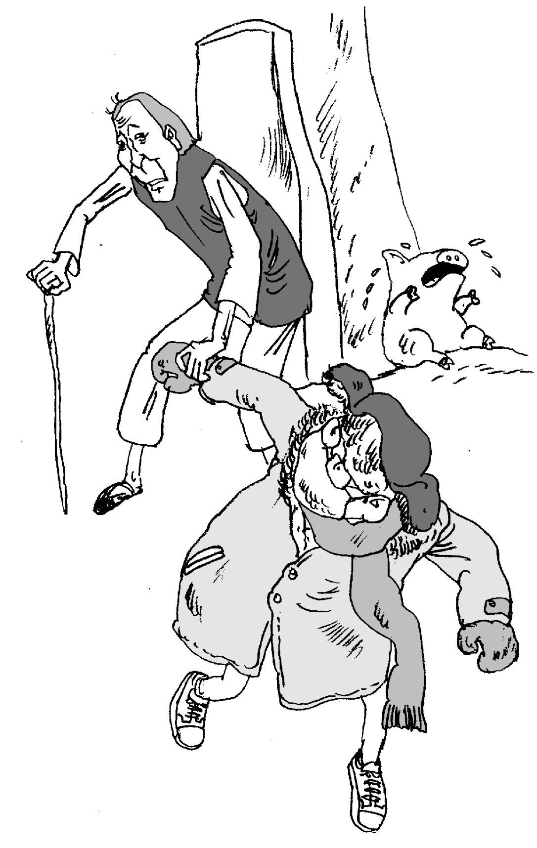 我扭头一看,是吴奶奶,她紧紧地抓住了我——刚才她一定是出门忘了什么东西,又回家取了,所以把小猪留在了外面。再出门时,她就看见小猪靠墙“呜呜”哭的一幕。