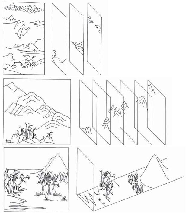 在构图方面,中国画的空间由多个“平面”(Plane)或平行四边形(Parallelogram)组成,采用的多是多点平行透视法(Parallel Perspective)【图1-9】,有别于西方焦点透视法。西方利用单筒镜(monocular)“固定视点”来制造墙上的一扇“窗”,把画面关在窗框之内。至于谢赫的“经营位置”则利用“移动视点”(moving focus),逐步重叠三角山形,创造超越窗框局限的“更开阔视野”(expanded field of vision)。因此,中国绘画注重“读”画,与西方以“看”(seeing)画为不同。多年来,我利用三幅示意图说明8世纪至14世纪,中国山水画如何运用画面上的平行四边形来表现空间【图1-10】。